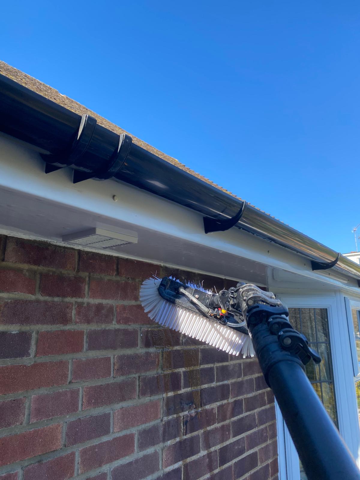 We use long-reach water-fed poles to clean your UPVC gutters, fascias and soffits safely from the ground — no ladders needed. This method lets us wash away years of dirt, algae and traffic grime without risking damage to your property.